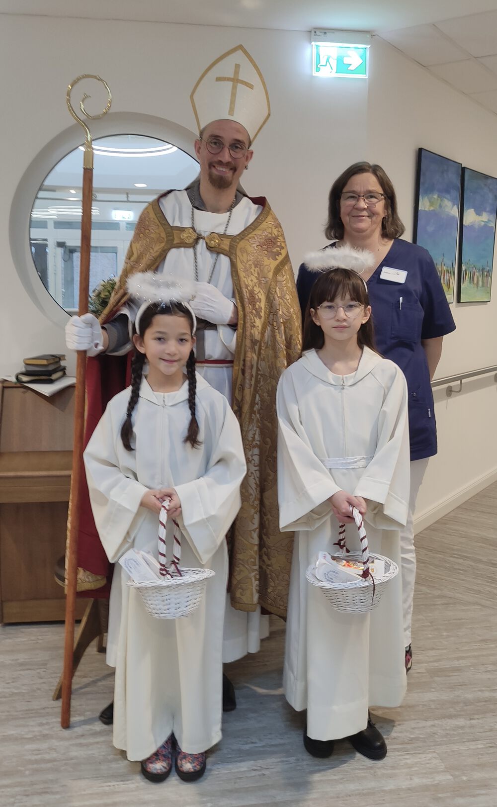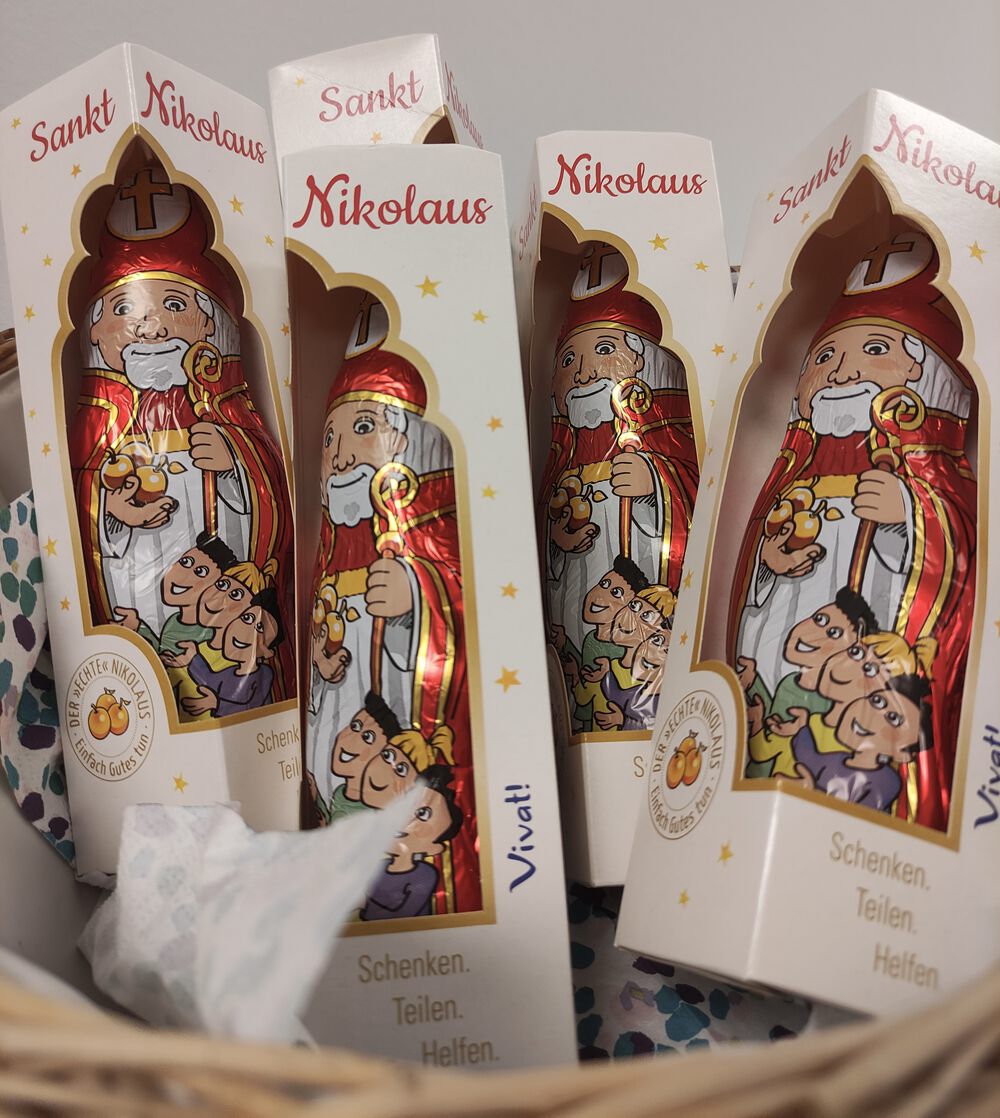 Am 06. Dezember wurde unser stationäres Hospiz in Hage von einer besonderen Adventsstimmung erfüllt: Der Nikolaus besuchte im Rahmen unseres Lebendigen Adventskalenders unsere Gäste, ihre Angehörigen und das Hospizteam - in Begleitung von seinen beiden Engeln. Gekleidet in seinen prächtigen Bischofsgewand mit Mitra und Bischofsstab strahlte der Nikolaus Würde und Güte aus. Mit ruhiger, aber eindringlicher Stimme berichtete der Nikolaus von den Taten, die sein Leben so besonders gemacht haben. Unterstützt von seinen beiden Engeln überreichte er jedem Gast einen Nikolaus aus Schokolade, der drei goldene Äpfel in der Hand hält - eine wunderschöne und symbolträchtige Darstellung, die auf die Legende und seine großzügige Spende an die drei armen Mädchen verweist. Der Besuch des Nikolaus war für alle ein besonderes Ereignis. Eine Angehörige sagte gerührt: "Das erinnert mich an meine Kindheit."