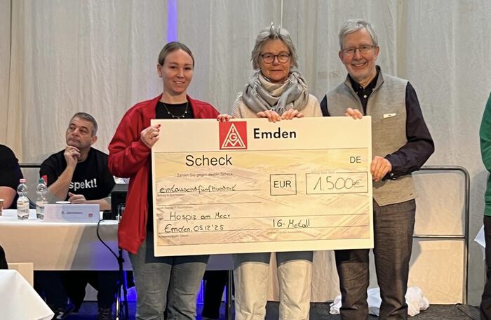 Im Rahmen der aktuellen Betriebsversammlung der IG-Metall im Volkswagenwerk Emden wurde dem Förderverein Hospiz am Meer am 5. Dezember durch die Gleichstellungsbeauftragte der IG Metall Sonja Thiele eine Spende in Höhe von 1500 € überreicht. Das Geld stammte aus dem Verkauf von Kaffee und Kuchen bei den Betriebsversammlungen der letzten drei Jahre. Drei weitere gemeinnützige lokale Projekte wurden ebenfalls mit Spenden bedacht.